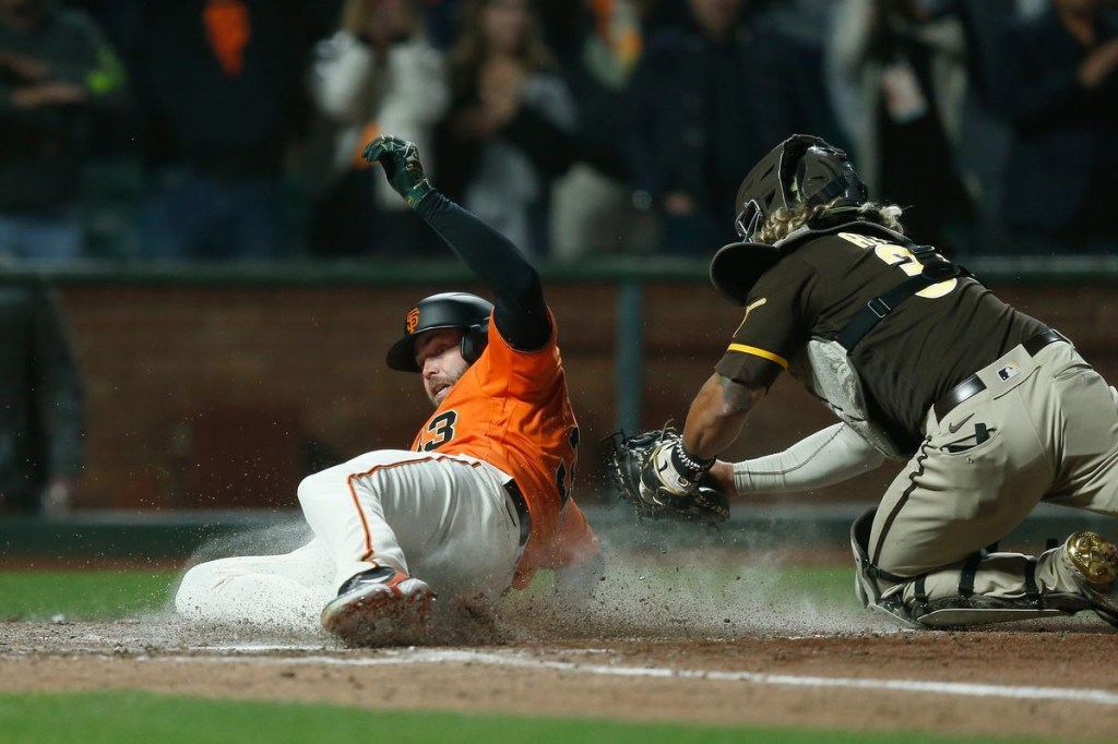 Surprisingly, we didn’t see Tyler Rogers’ twin brother, Taylor, for the bottom of the ninth—I guess the Padres wanted to give him some rest. The Padres went to the right-handed flame-throwing sinker-baller, Luis Garcia, who made quick work of Joey Bart—who came in for Curt Casali after taking a shot to the mask earlier—and Luis Gonzalez, striking out both of them. Mike Yastrzemski hit a bullet into the hole at short that Padres’ shortstop, Ha-Seong Kim dove to his right to to knock down, but he Kim couldn’t get Yaz at first. Darin Ruf, looking for his third home run, instead drew a walk; and then the Giants sent up Joc Pederson to pinch hit, and Joc worked an 0-2 count to a walk to load the bases for Wilmer Flores, who tied the game with a base-hit to left, just over the head of Kim, and Ruf scored the tying run just ahead of the tag at the plate.